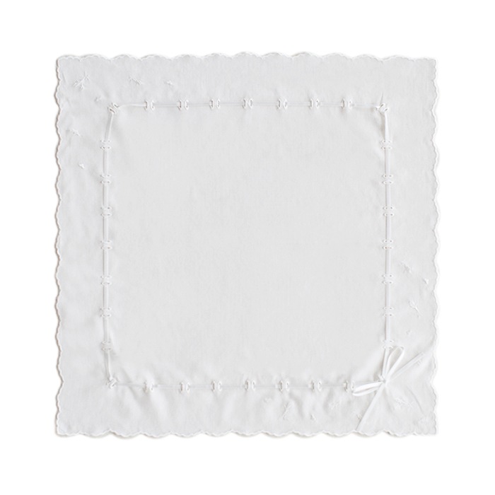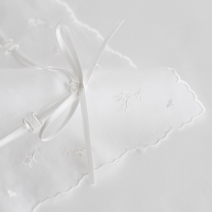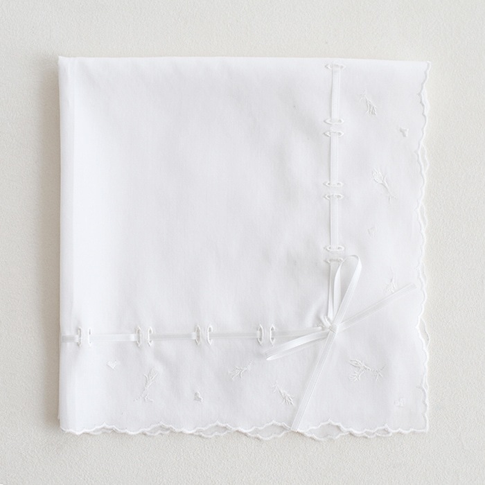 ハンカチーフにリボン通しのボーラーを刺繍で作り、実際にサテンのリボンを通しました。