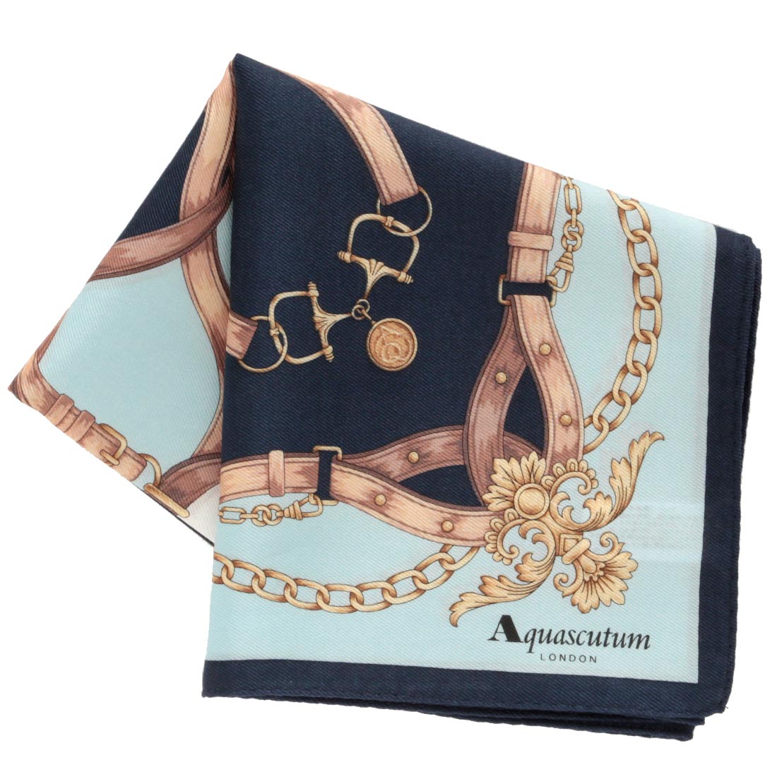 アクアスキュータム 大判 綿シルクハンカチ(58cm)ベルト柄&メタルモチーフ ネイビー 【Aquascutum】