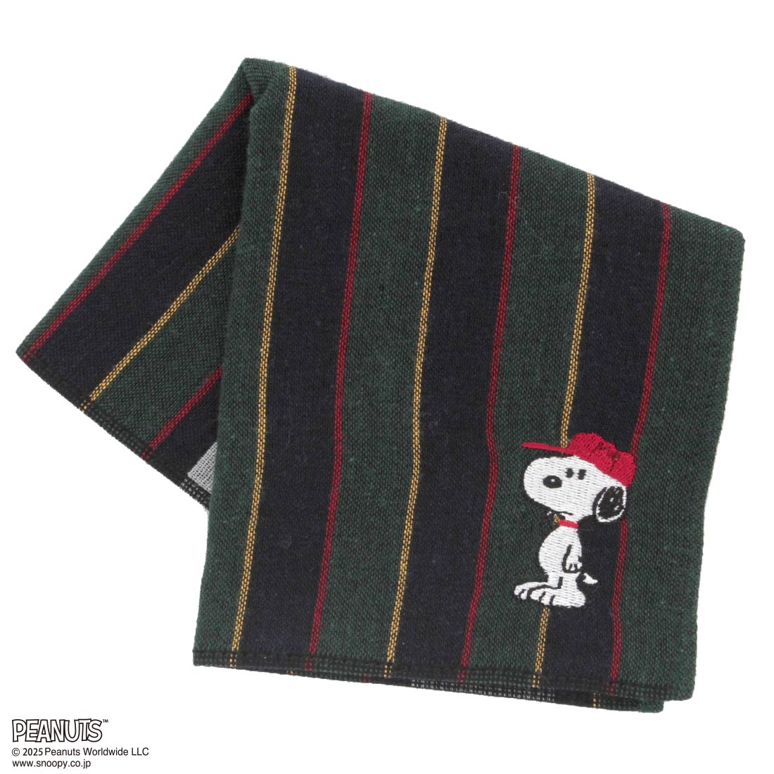 トラッドなストライプ柄のガーゼ&パイルハンカチ。PEANUTSのコミックでお馴染みの「野球」をテーマに、ベースボールキャップを被ったスヌーピーの刺繍がポイントです。