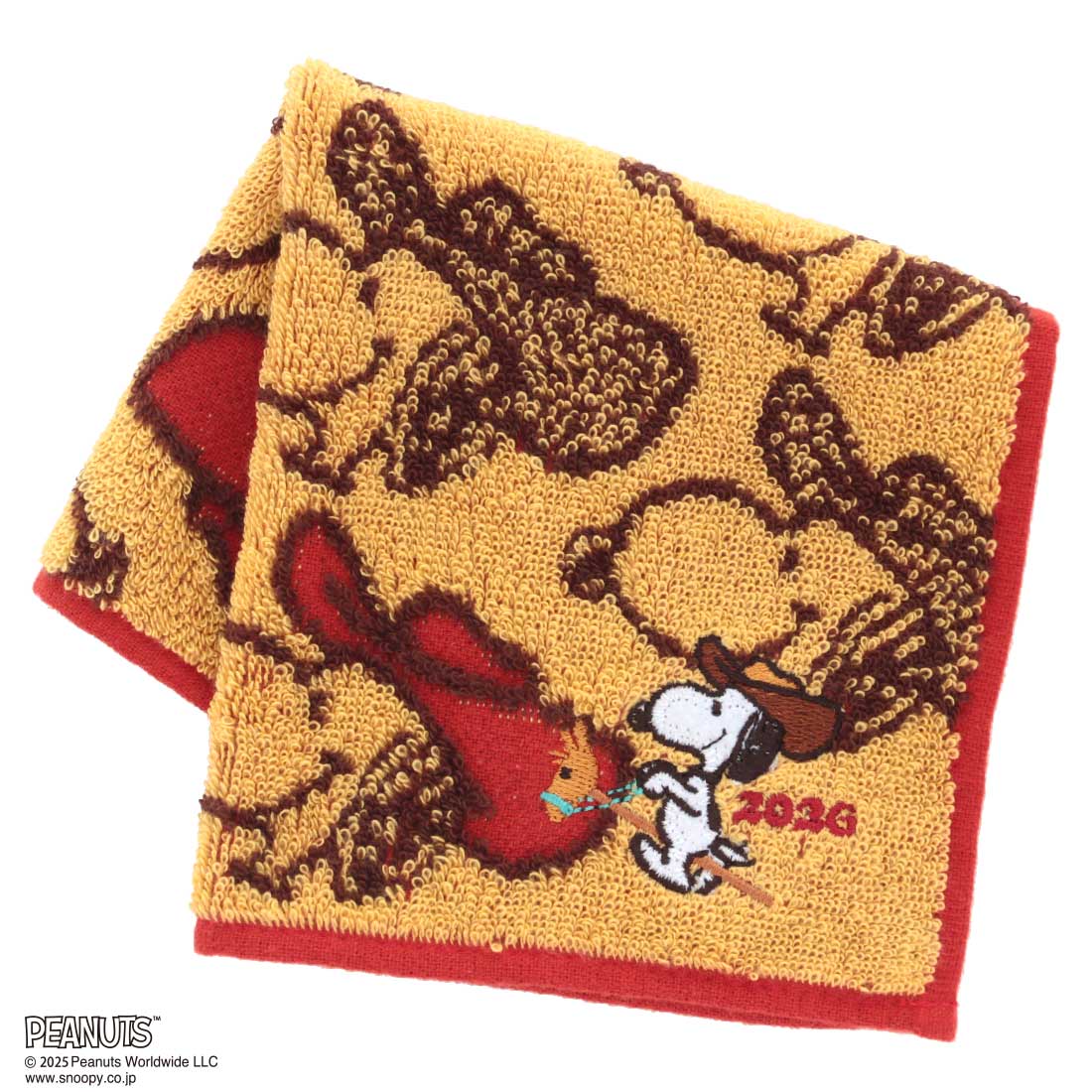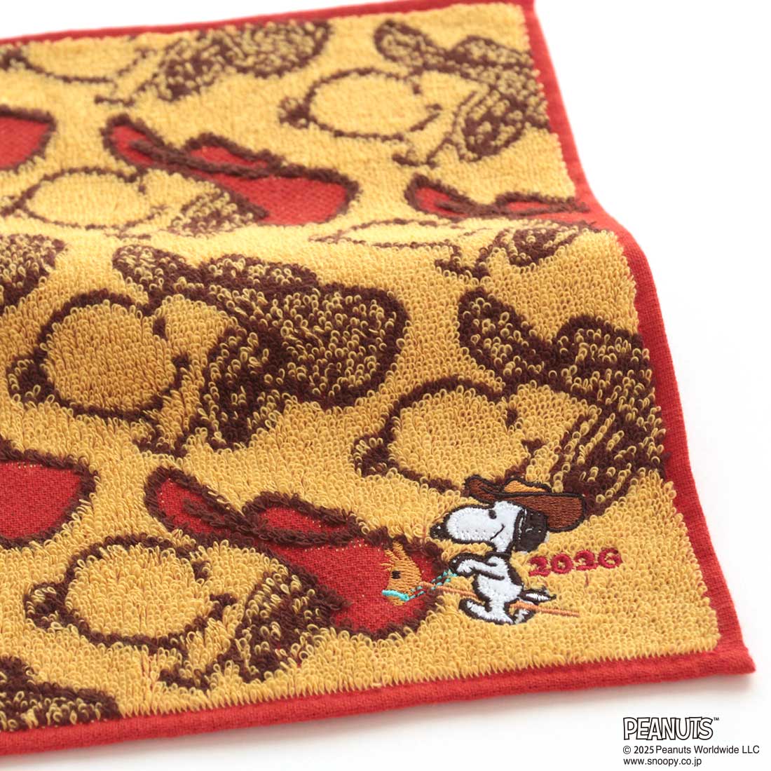 テンガロンハットをかぶったスヌーピーが特徴的なタオルハンカチです。右下の棒馬にまたがるスヌーピーと2026の刺繍がポイントです。