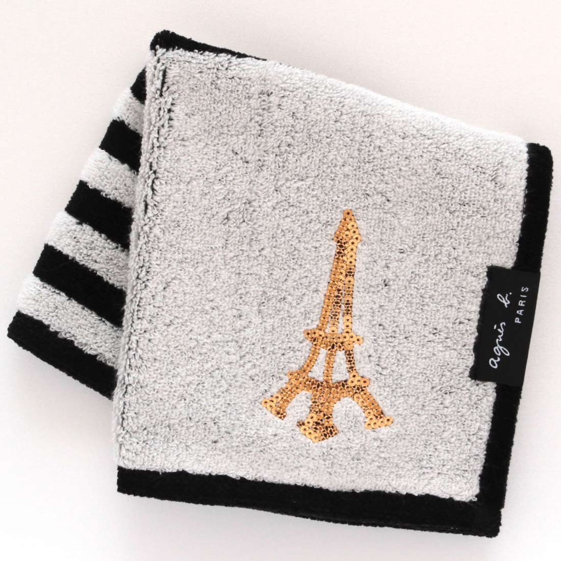 アニエスベー 大判 タオルハンカチ(28cm)(ブランド専用ギフトボックス入り)スパンコール エッフェル塔 ホワイト 【agnes b】