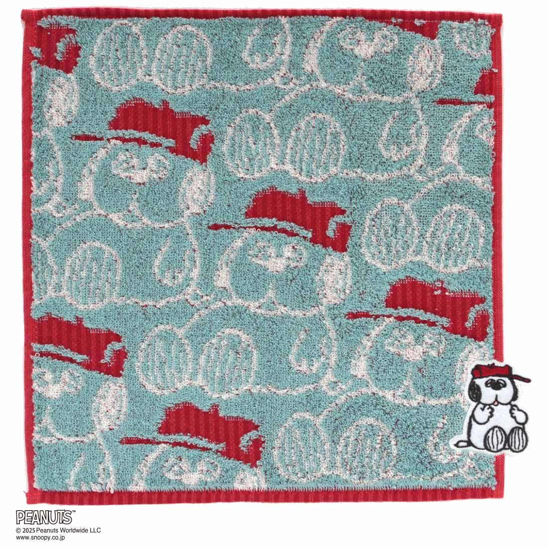 スヌーピーのきょうだいオラフが全面に描かれたタオルハンカチです。配色ごとに異なる帽子のカラーがポイント。