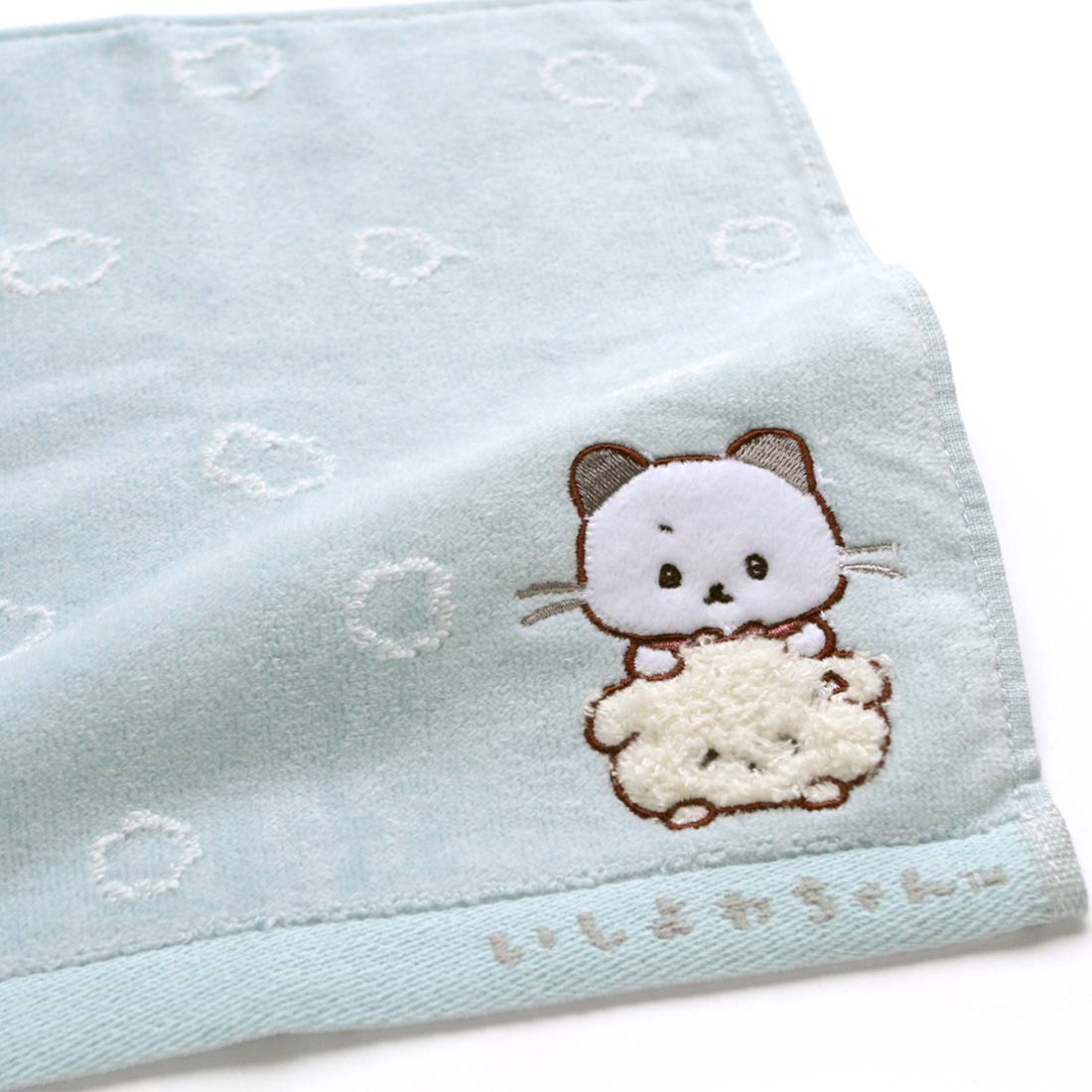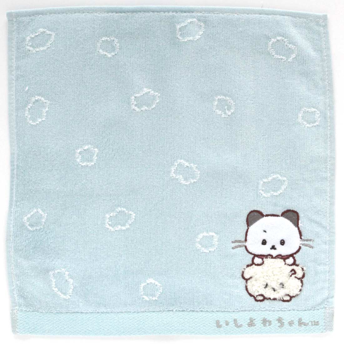 いしつよちゃんと一緒だったり、ポージングが違ういしよわちゃんのアップリケが特徴的なタオルハンカチ。シンプルの中にも、ほっこり笑顔になれるデザインです。