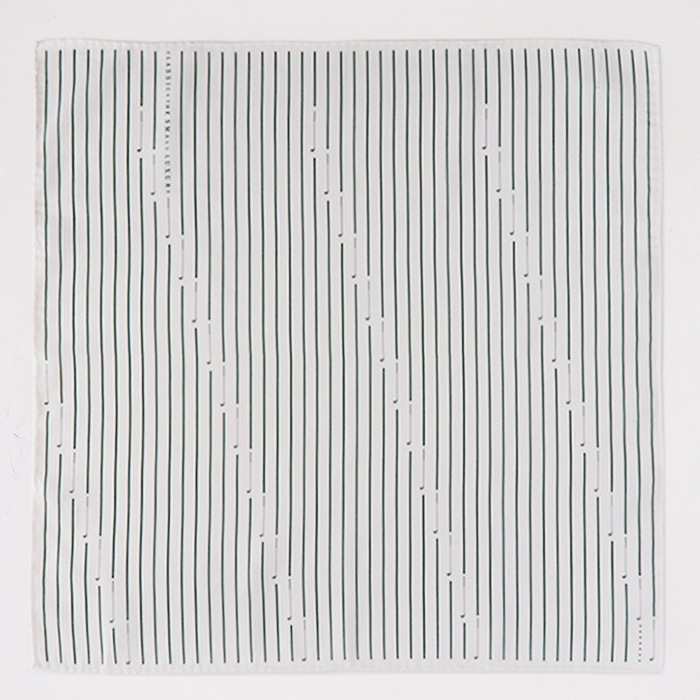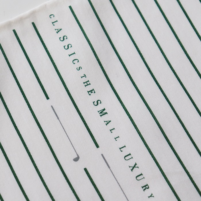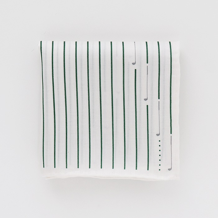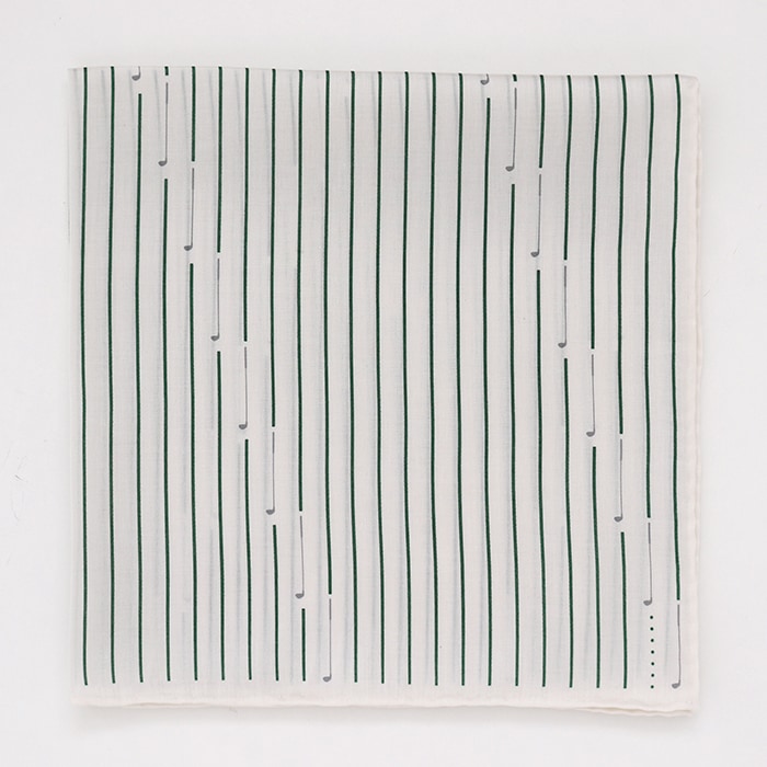シンプルなストライプとゴルフドライバーを組み合わせたデザイン。ゴルフボールをイメージした右下のドットがアクセントになっています。生地はつややかで滑らかな素材感のマスターシードサテンを使用し、ハンカチーフのふちは丁寧に一枚一枚ミシンを使わず手縫いでふっくら立体的に巻き上げております。