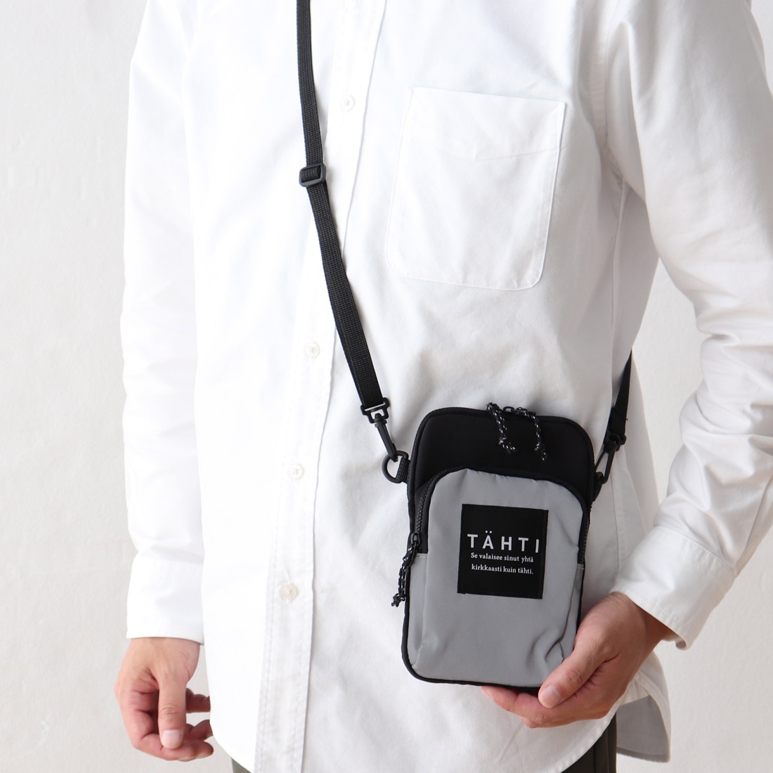 ポーチ本体に反射素材を使用した、光るスマホポーチ。収納部分にはファスナーが付いており、スマホや小物の落下・紛失防止に役立ちます。コンパクトな仕様で、旅行以外の通勤通学にも便利にお使い頂けます。
