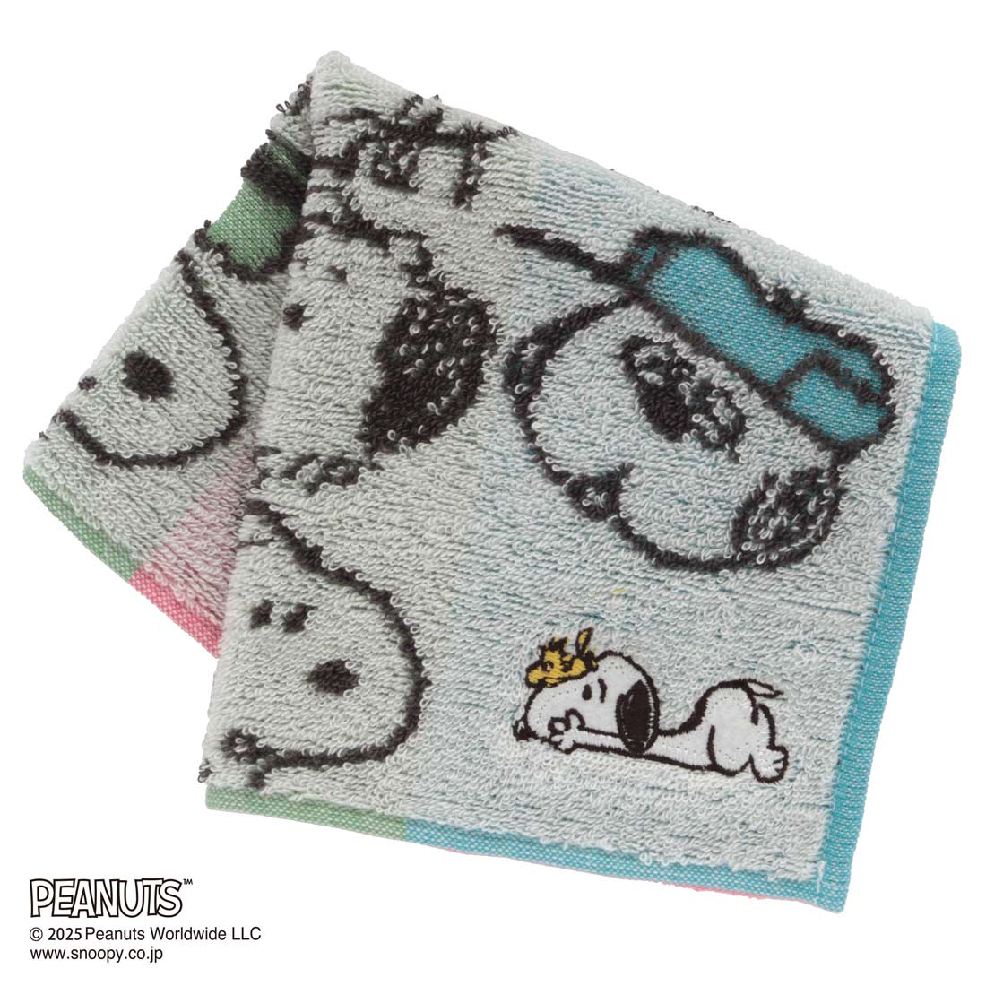 パイルジャカードタイプのタオルハンカチです。スヌーピーときょうだいたちのお顔が配列されたデザイン。右下のスヌーピーの刺繍は配色ごとにポーズ違いで3種類。