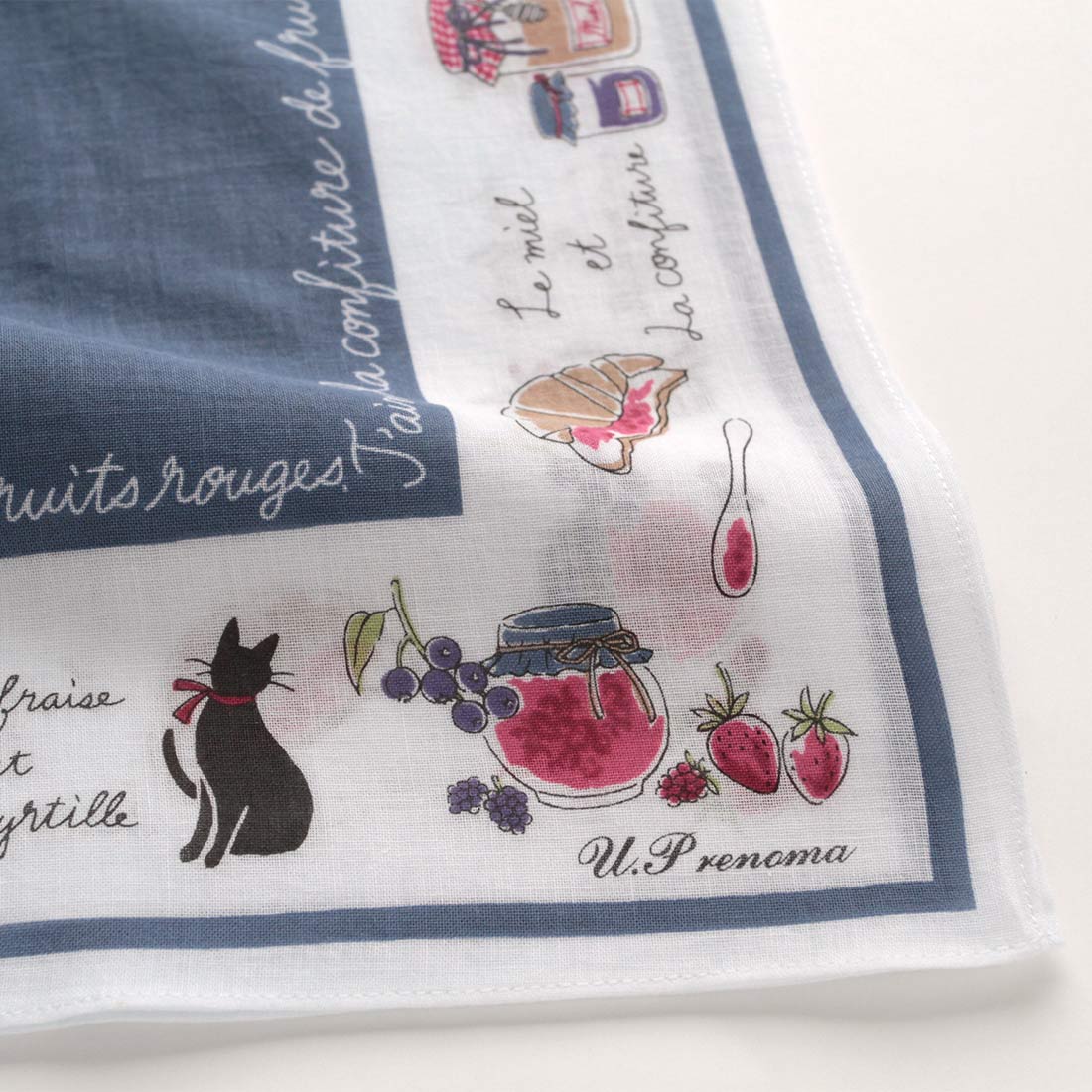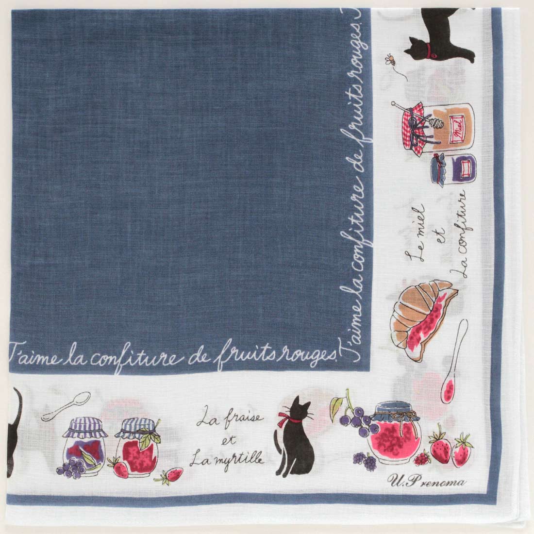 コンフィチュール(ジャム)やクロワッサンなどパリの美味しいものをモチーフにした大判ハンカチ。ハンカチの中心部分には「赤い果物のコンフィチュールが好き」とフランス語で書かれています。