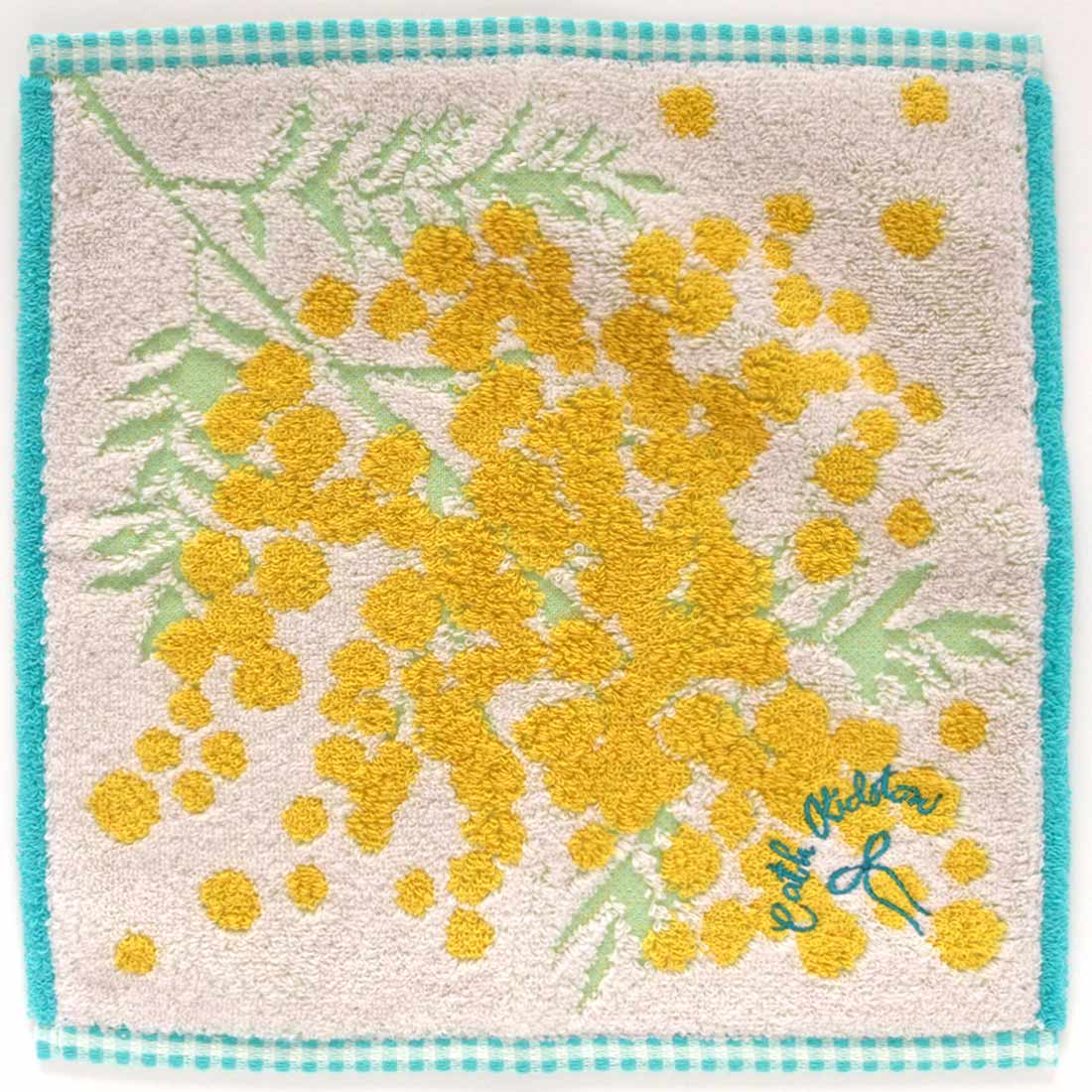 オーガンジー巾着に入った、ギフトにぴったりのタオルハンカチ。ミモザ柄がのイエローが目を惹くタオルはふわふわで手触り抜群です。