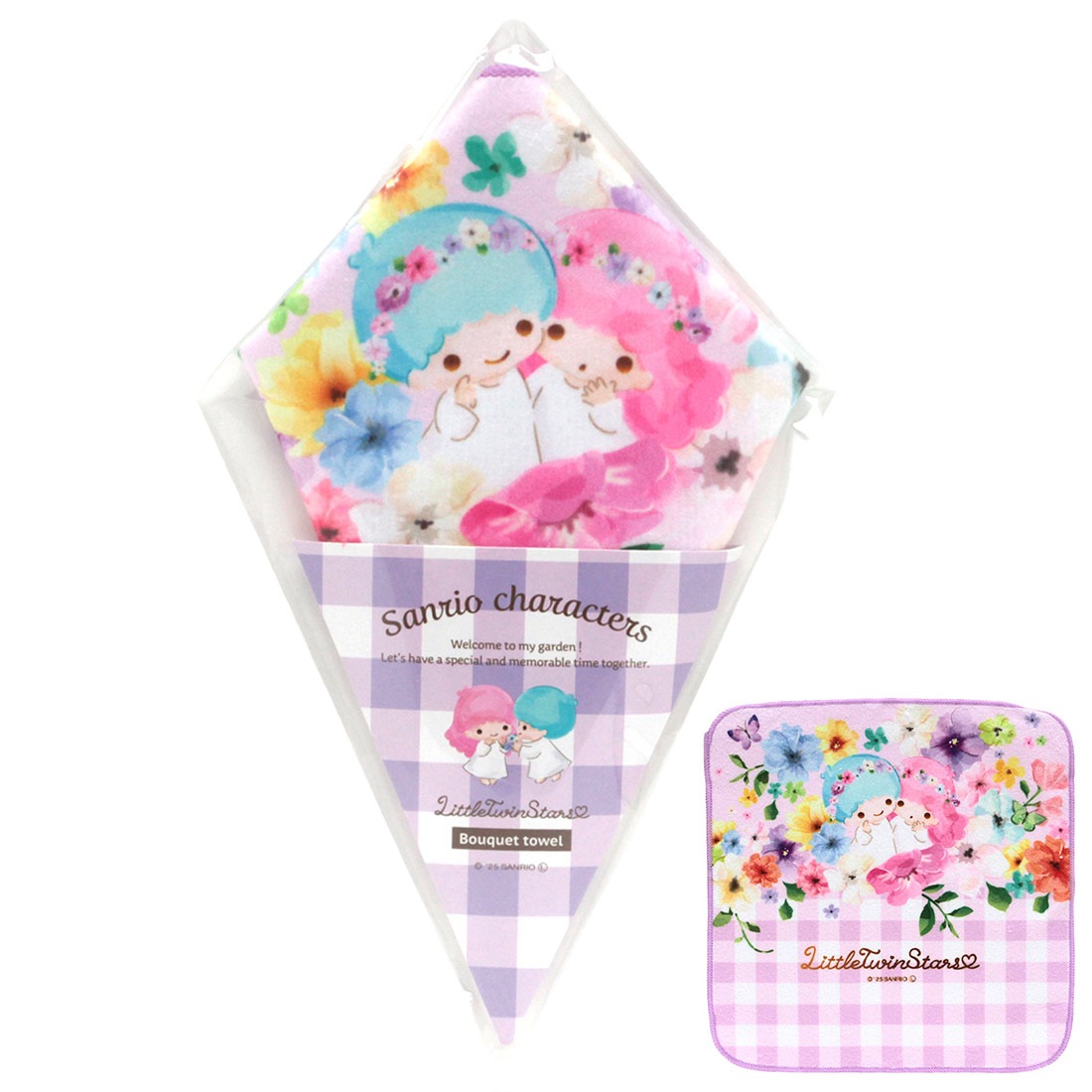 大人っぽいパステルビビットな水彩花柄とキャラクター達が戯れてるよ。まるで花束のようなブーケの形のタオルハンカチ。今年はツインリトルスターズも仲間入り!