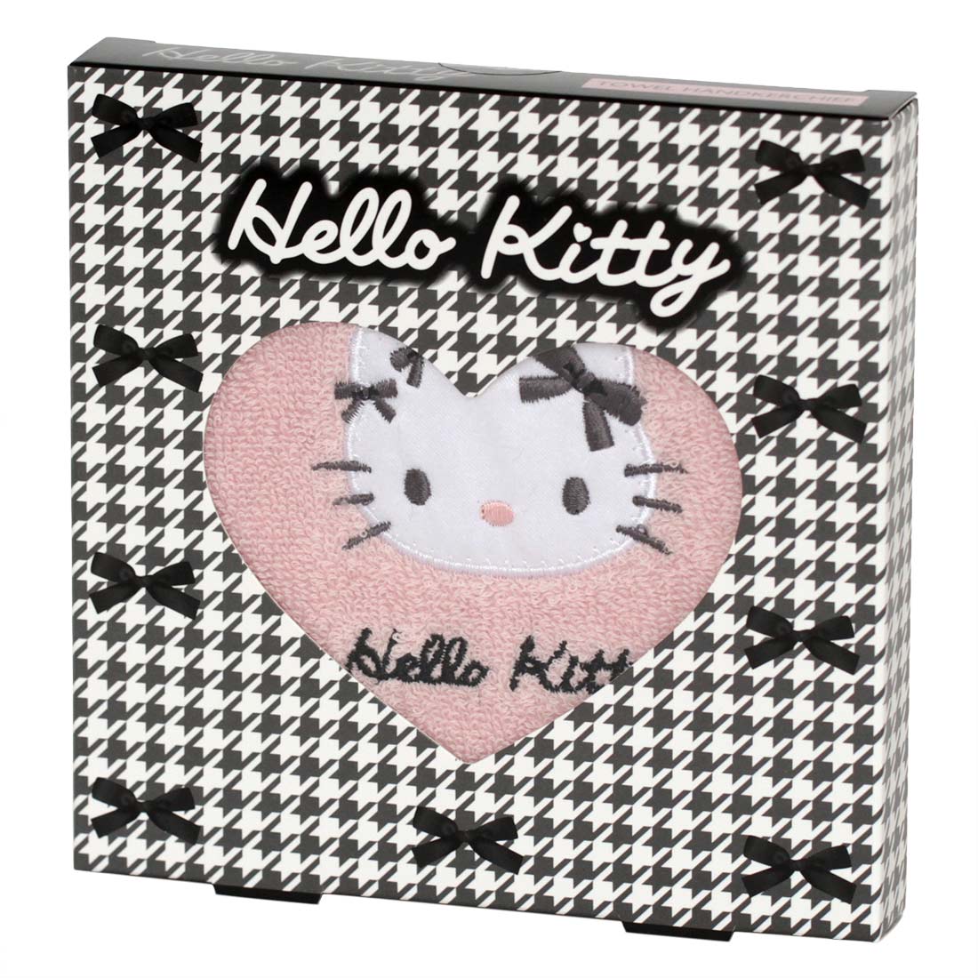 大人っぽいモノトーンのデザインにZ世代が持ちたくなるようなトレンドの小物やモチーフを取り入れたデザイン。リボンがそれぞれ違うハローキティのアップリケが可愛いギフトボックス入りのタオルハンカチです。