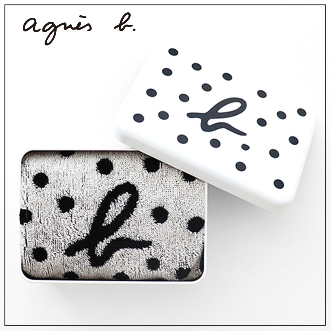 アニエスベー タオルハンカチ ドット&b.ロゴ(筒形缶パッケージ入り ロゴ) ブラック 【agnes b】